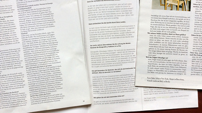 Was ist bei der typografischen Gestaltung von Interviews zu beachten? In der Regel unterhalten sich verschiedene Personen, meistens zwei. Davon stellt die eine die Fragen, die andere antwortet. Beide haben auch unterschiedliche Stimmen, Temperamente, Ausdrucksweisen usw.. Grund genug, die beiden auch typografisch auseinanderzuhalten. Aber es ist ein Gespräch, der Fluss der Unterhaltung muss gewahrt bleiben. Hier sind neben den Leerzeilen auch der allzu große Unterschied zwischen dicker und dünner Schrift störend. Auf dem Foto ist links die Zeitschrift Galore zu sehen. Eine reine Interview-Zeitschrift. Schlicht, aber gut gemacht, die Unterhaltung wird nicht gestört. Rechts das ZEIT Magazin mit eingerückten Antworten – auch gut zu lesen. Beide kommen übrigens mit kleinerer Schrift aus und sind dennoch sehr gut lesbar.
